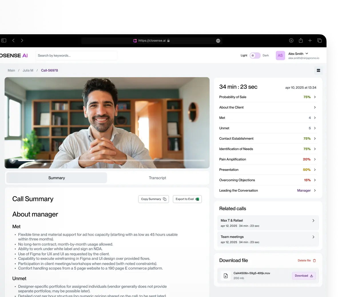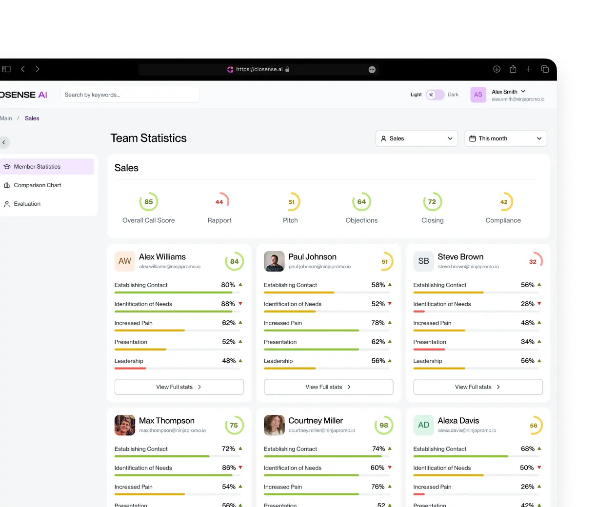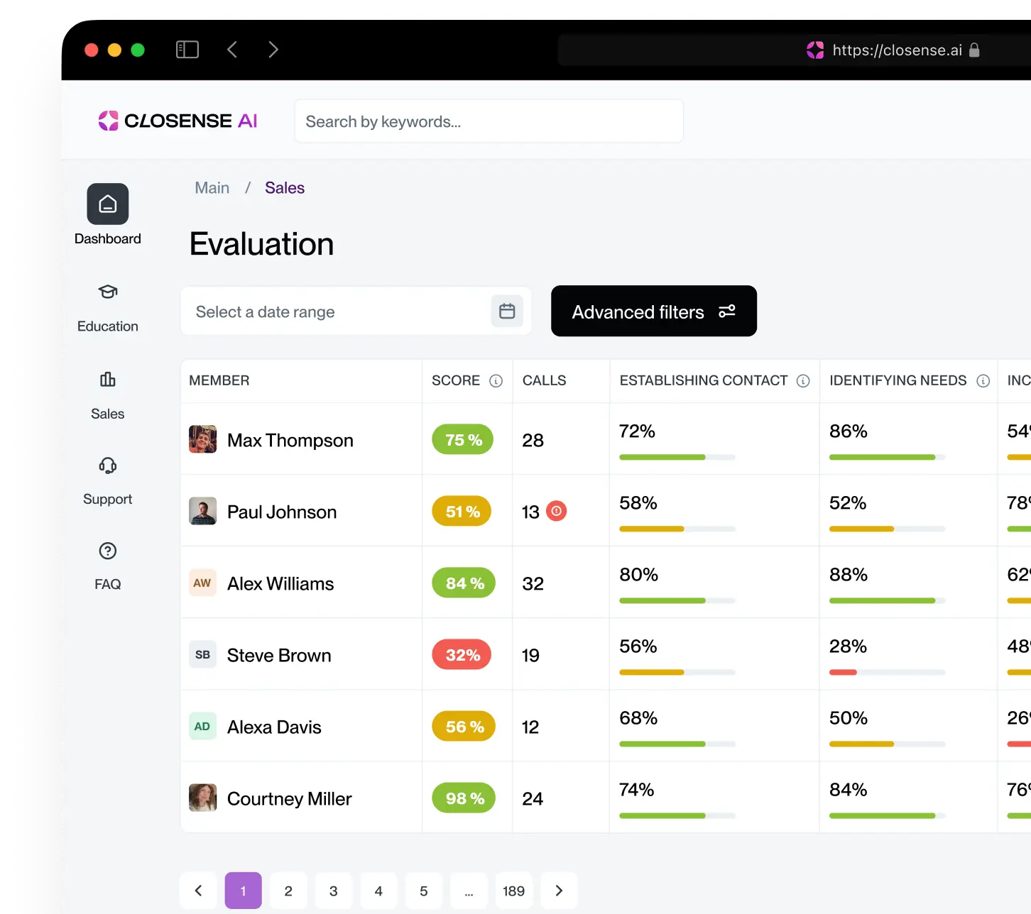 You define the rubric. Typical categories are discovery, qualification, objection handling, next steps, talk ratio, compliance moments, and key behaviors you expect from reps. Closense scores each call and shows evidence and timestamps behind the evaluation.