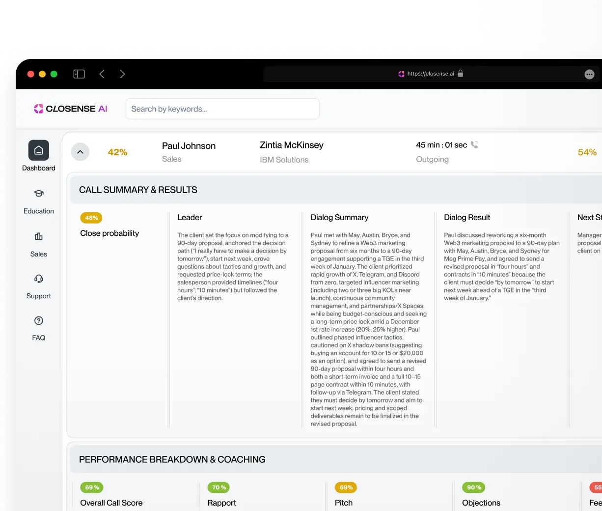 Closense improves the behaviors that drive revenue on calls: stronger discovery, cleaner qualification, better objection handling, and clear next steps. Teams typically see higher stage-to-stage conversion and fewer stalled deals once coaching becomes consistent. Impact depends on your traffic quality, sales cycle, and how fast you roll coaching into the process.