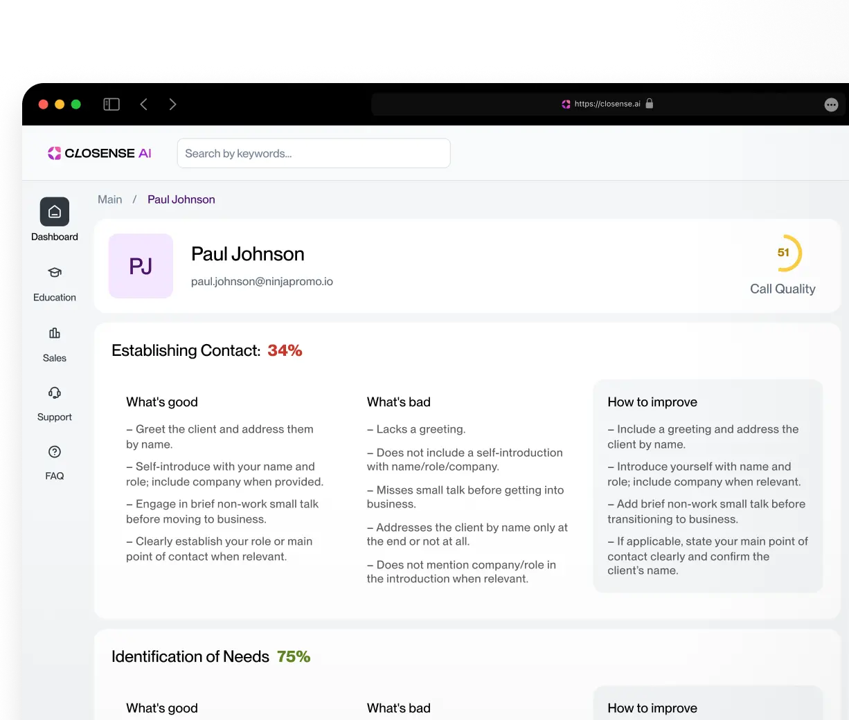Closense focuses on QA and coaching outcomes: scoring against your rubric, consistency across calls, and turning reviews into clear coaching actions. It’s built to reduce manual QA and make performance review repeatable.
